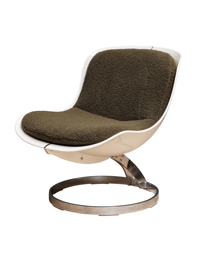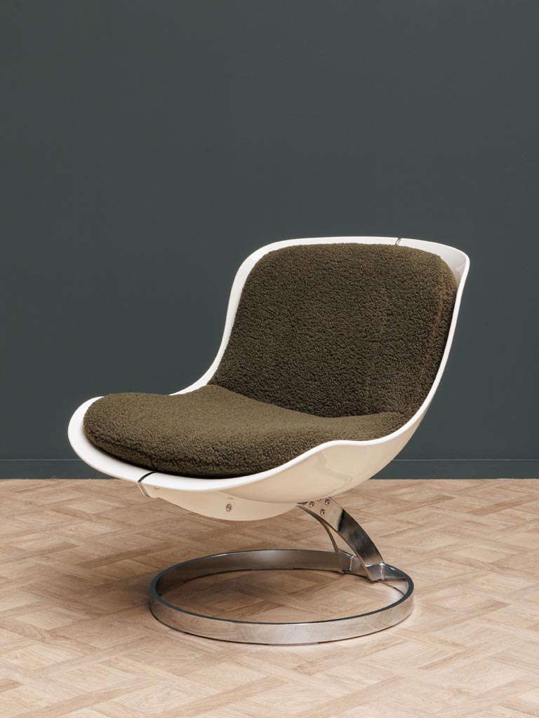 כורסא בעיצוב רטרו־עתידני, בעלת גוף פלגלס מבריק עם רגל מתכת מעוגלת וברגים גלויים המשמשים כפרט עיצובי למראה תעשייתי.
