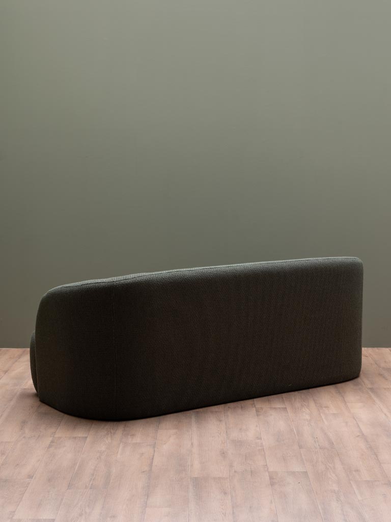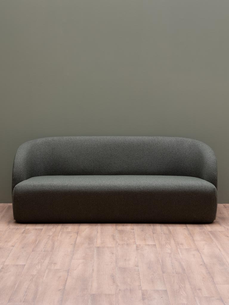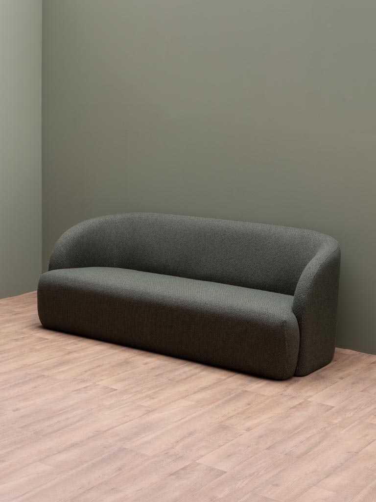 ספה שלושה מושבים בגוון ירק זית טבעי, בעיצוב מעוגל ורך, מראה מינימליסטי אך עשיר. הצורה הזורמת מעניקה תחושת שלווה ורוגע בעוד שהבד מוסיף עומק וחמימות עדינה לחלל. הריפוד מבד קשיח ומעט שעיר.