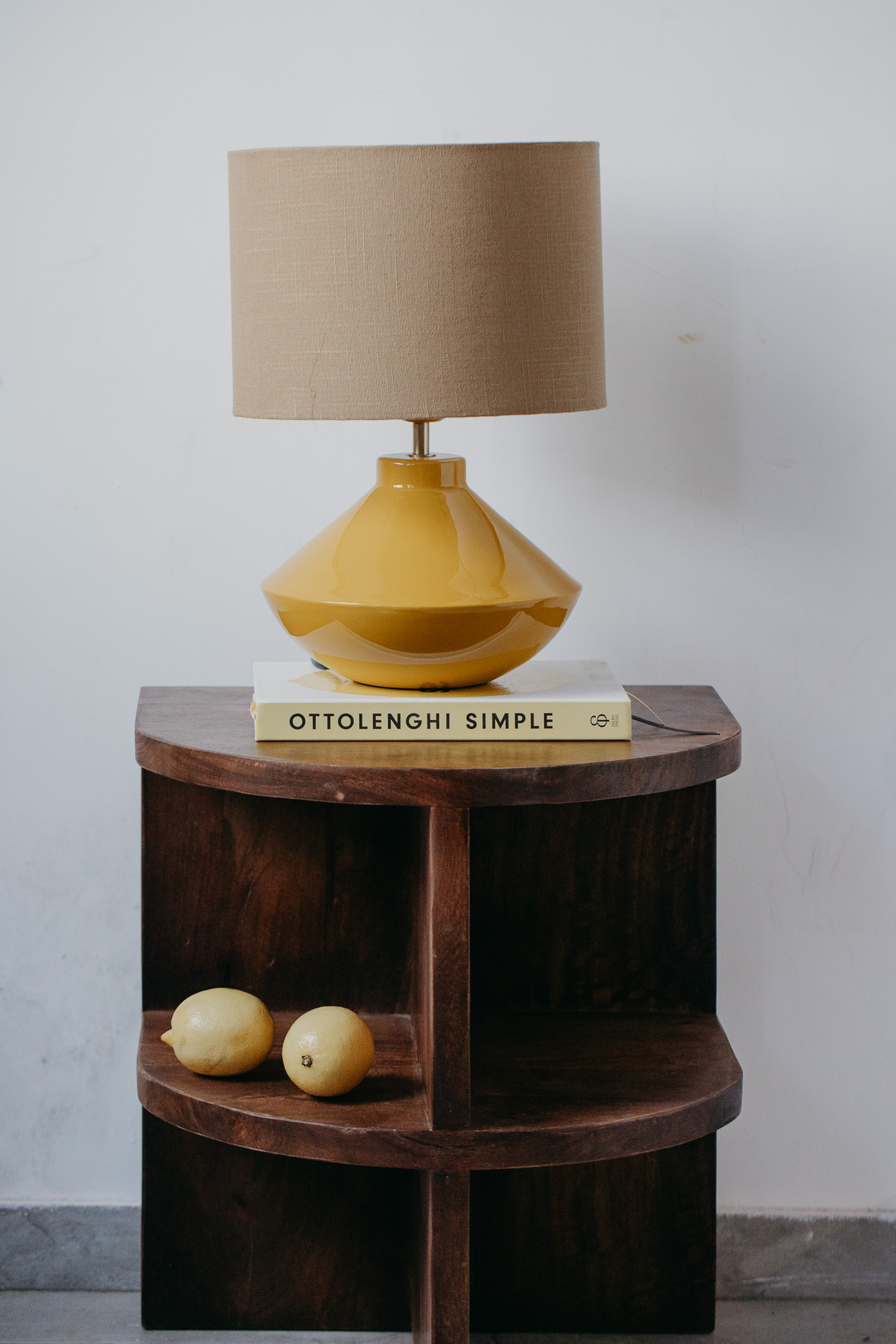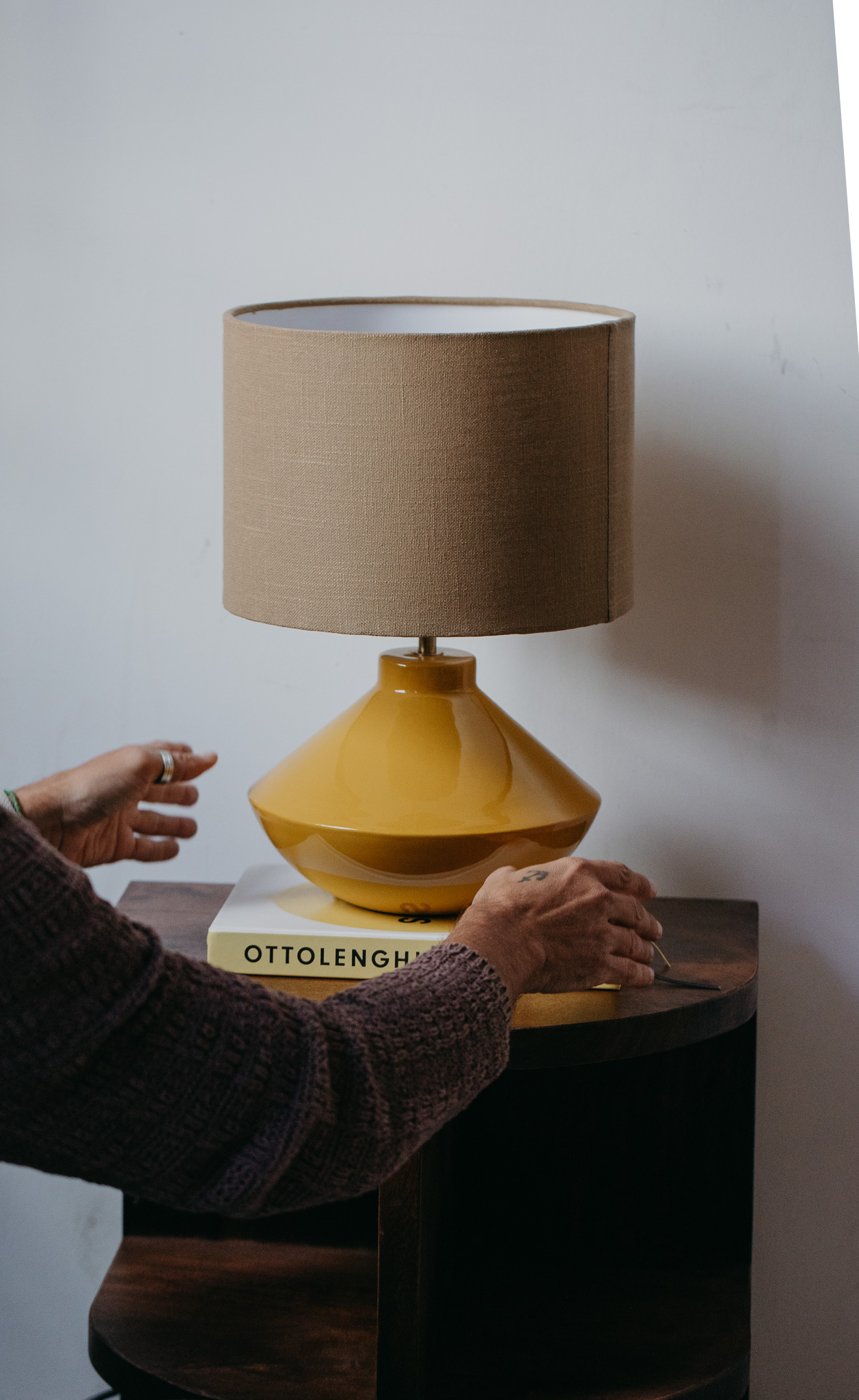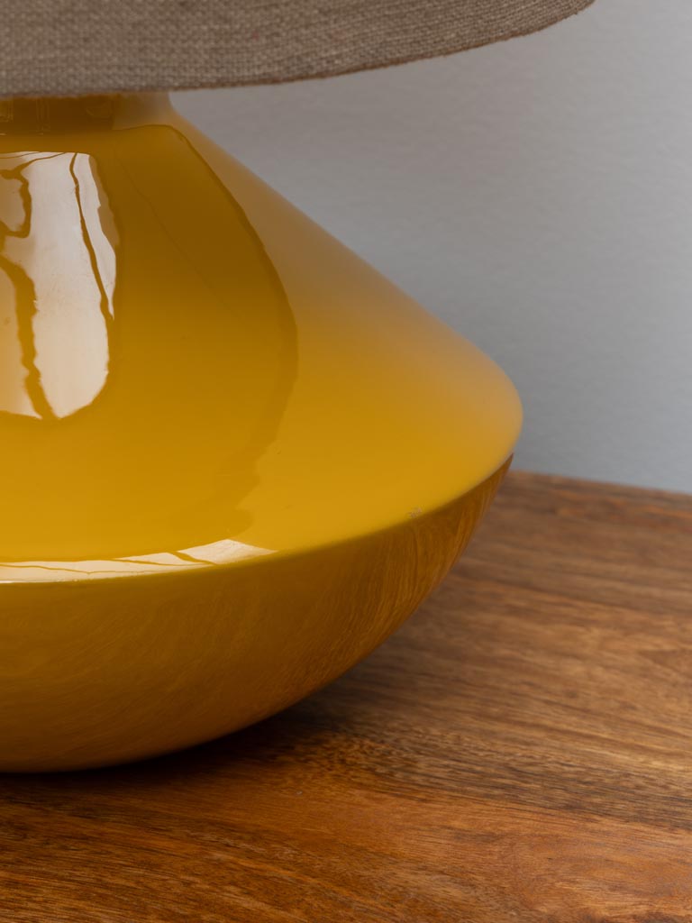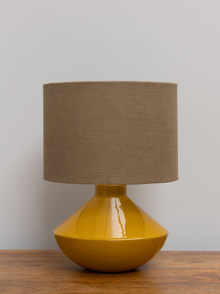 מנורת שולחן בצבע צהוב חרדל, עיצוב רך ועגול, גוף מתכת בגימור מבריק עדין ואהיל כותנה, מייצרת תאורה נעימה ורכה