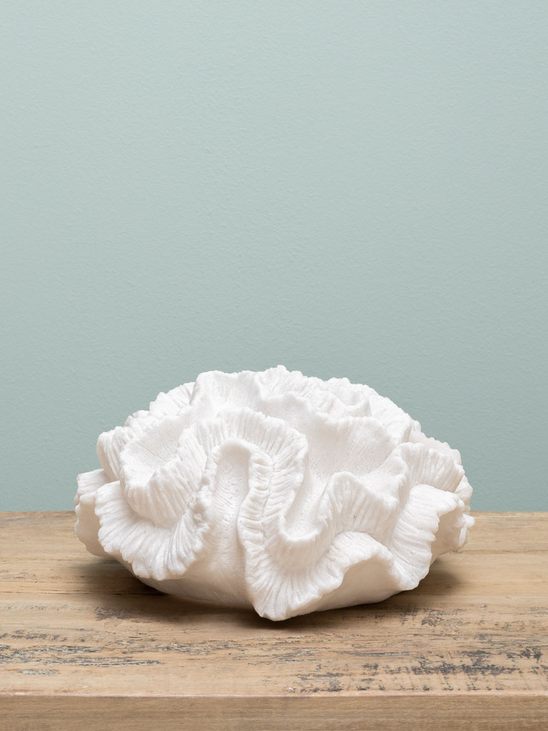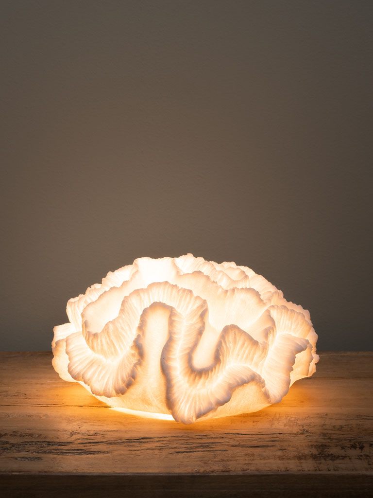 מנורת שולחן בעיצוב פיסולי, בהשראת אלמוג מסוג Agaricia, אלמוג בעל מבנה גלי ורך המזכיר קפלי תחרה טבעיים.