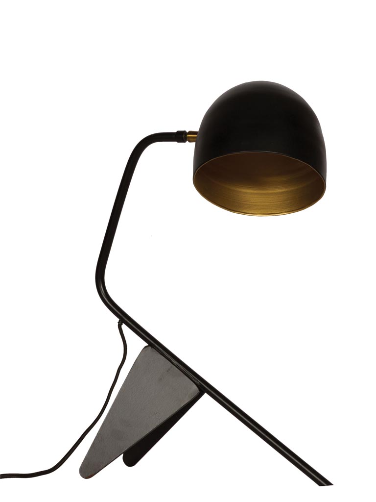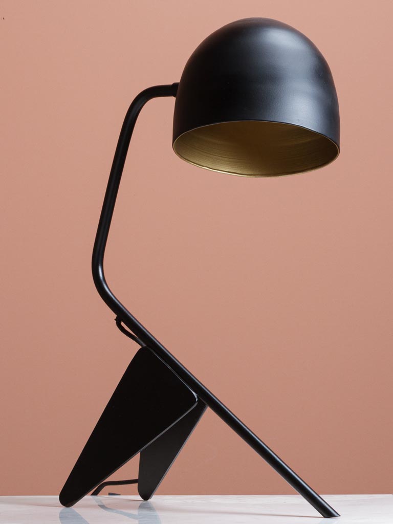 מנורת שולחן מתכתית אלגנטית בעיצוב וינטג׳ תעשייתי נקי, עם גוף שחור בגימור מט וגוון פנימי מוזהב שמפיץ אור חמים ונעים.העיצוב המשולב של קווים ישרים ועיקול עדין מעניק למנורה מראה אדריכלי וקליל, המזכיר כנף בתנועה.