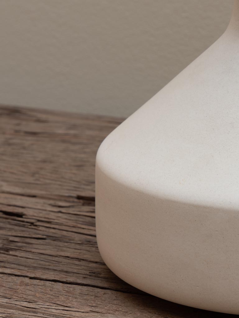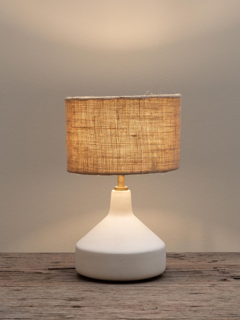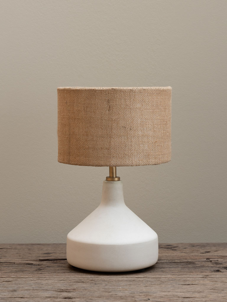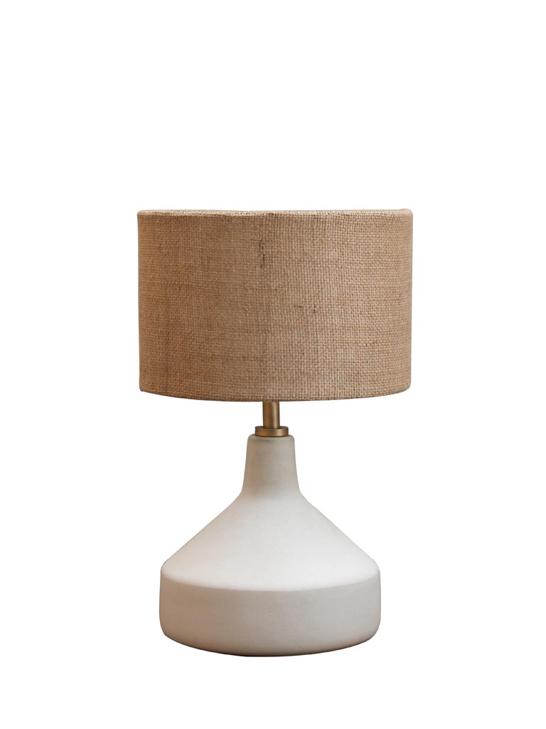 מנורת שולחן בעיצוב נקי ומעודן, עם בסיס קרמי בגוון אבן טבעית וכיפה עשויה בד יוטה טבעי.