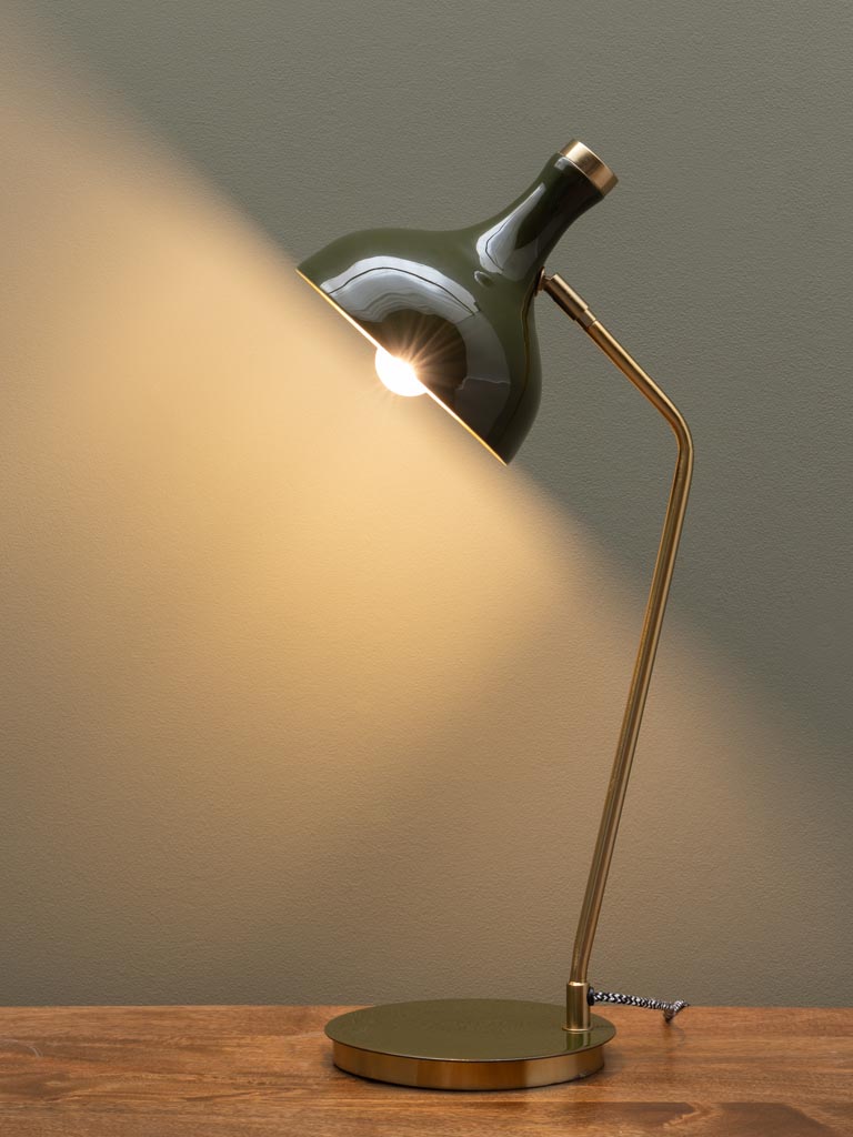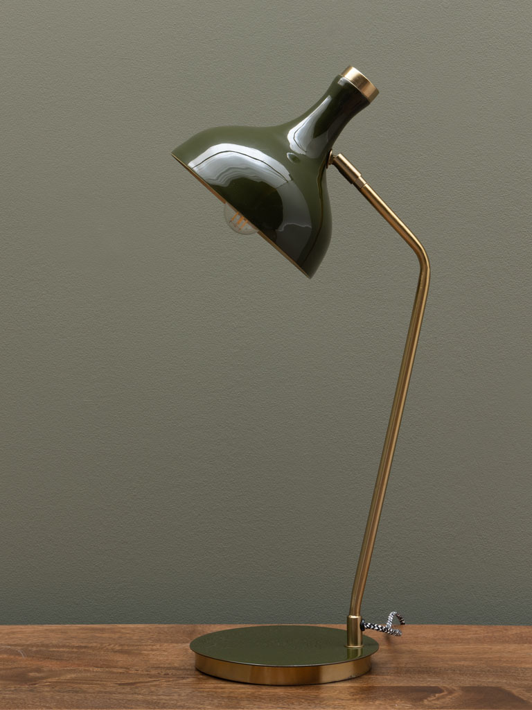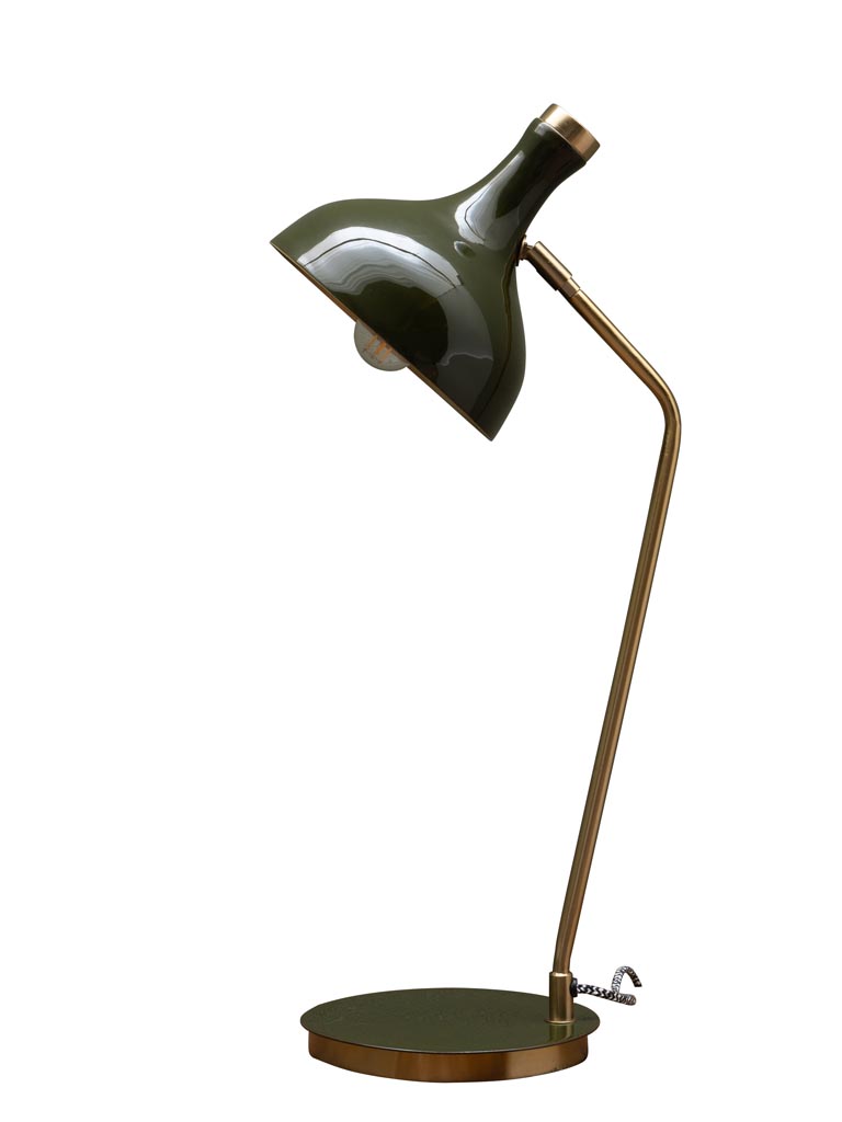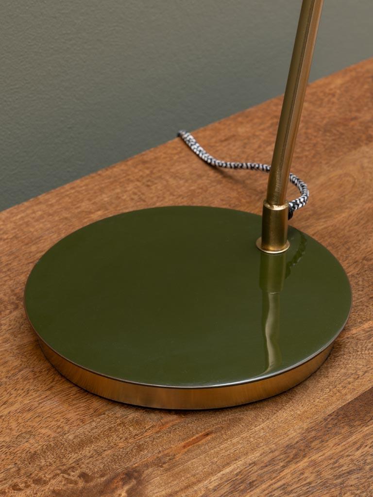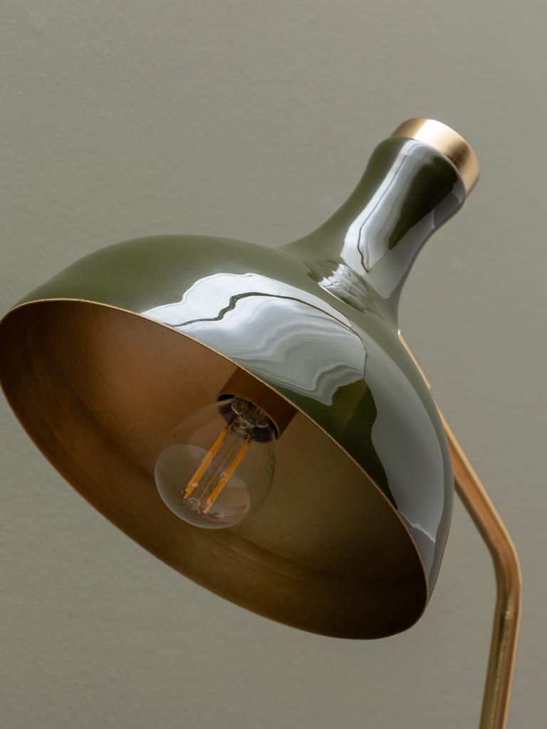 מנורת שולחן בעיצוב אלגנטי עם בסיס ומבנה מתכת בגימור זהב מוברש וגוף תאורה בגוון ירוק זית עדין.