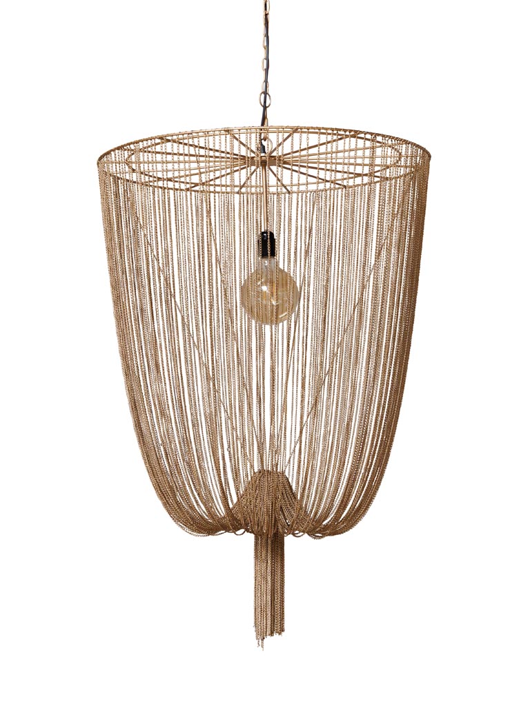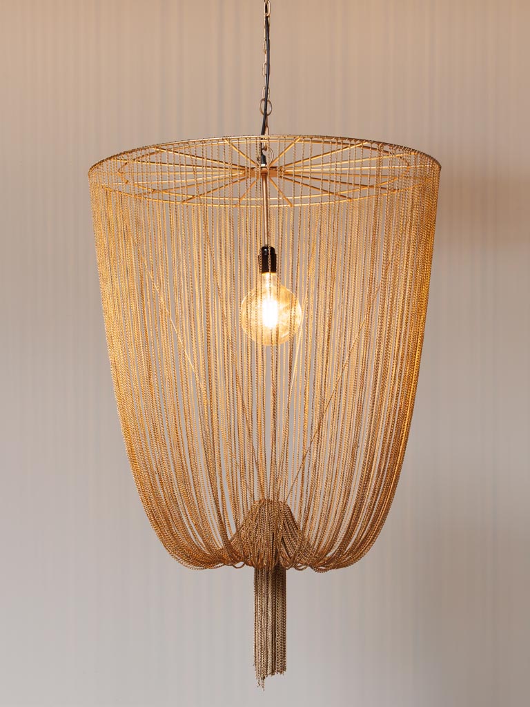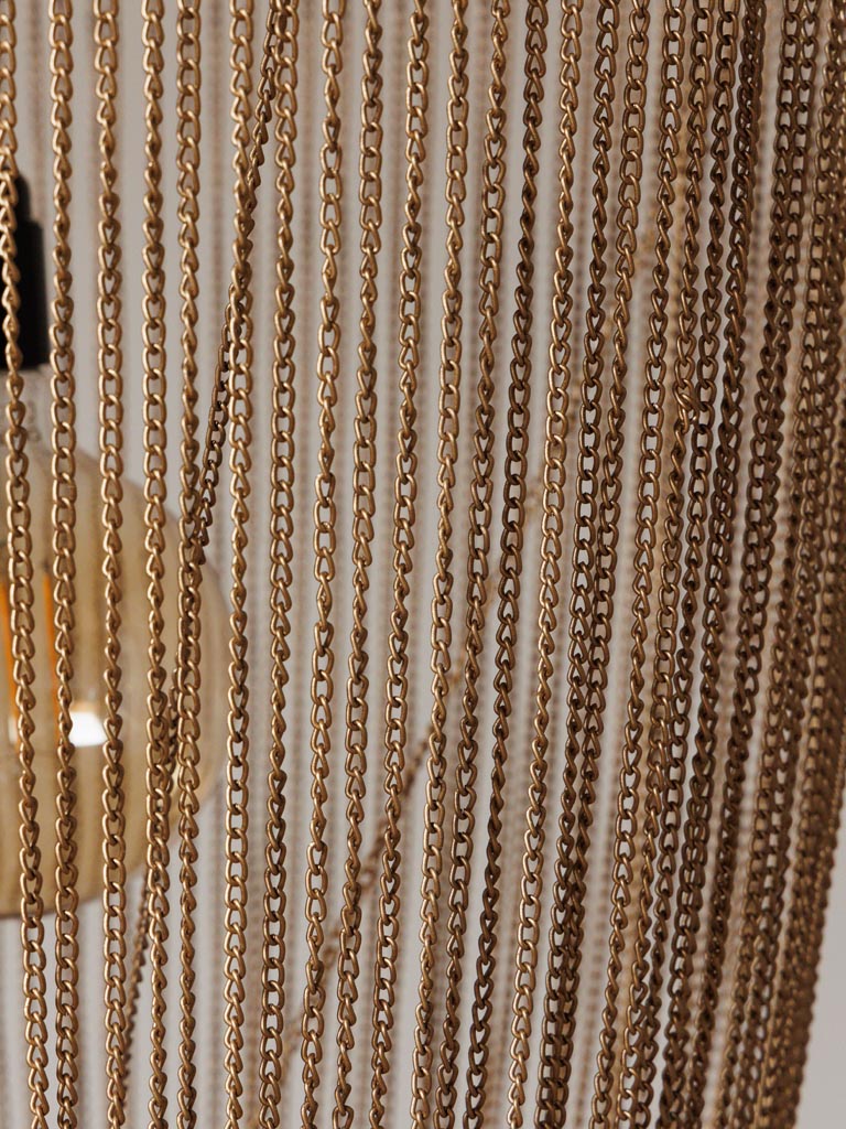 מנורת תקרה משרשראות מתכת דקות מוזהבות.