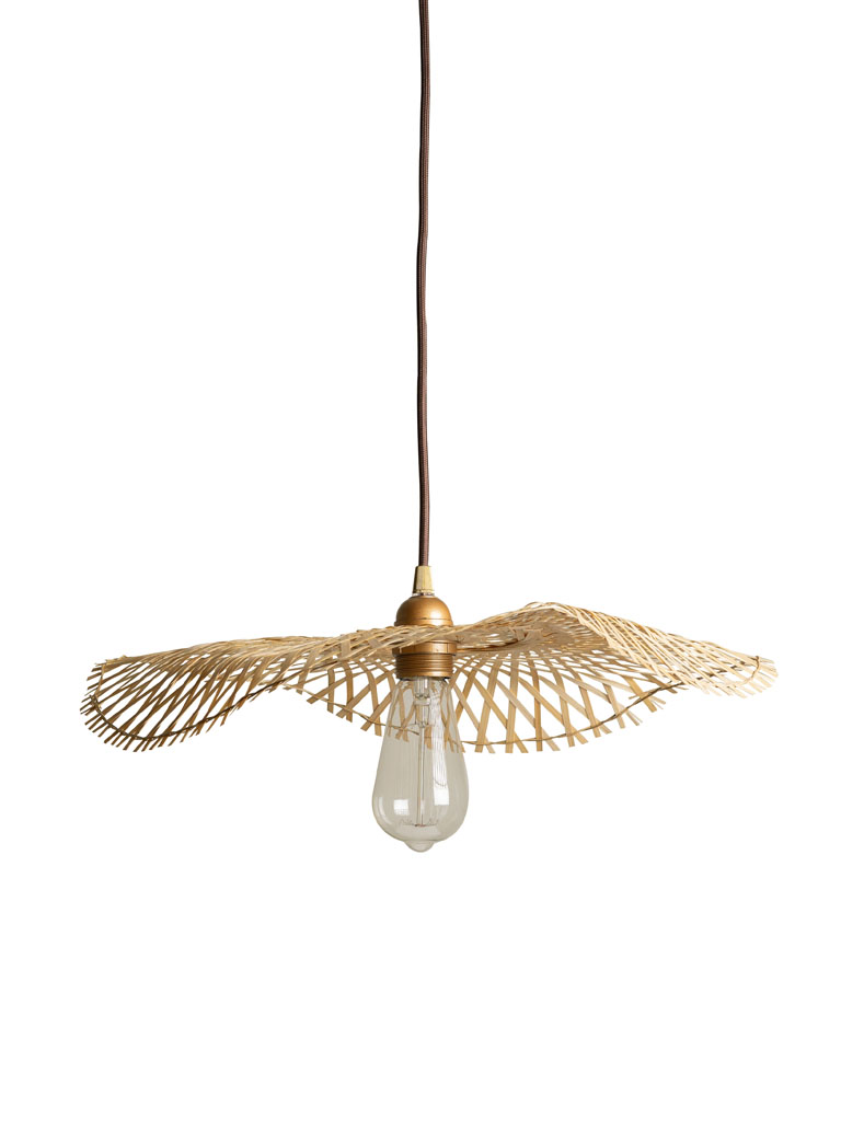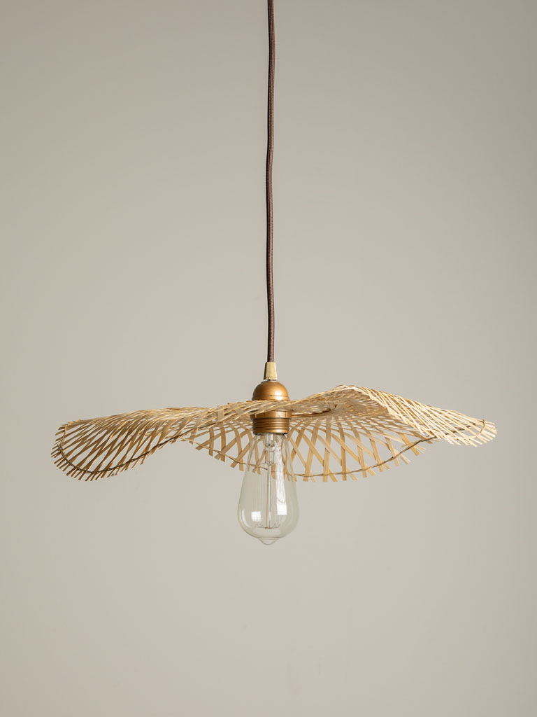 מנורה עשויה במבוק קלוע בעבודת יד, בעיצוב פתוח וזורם.