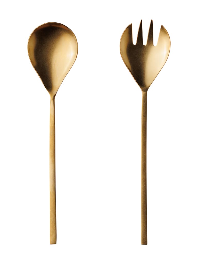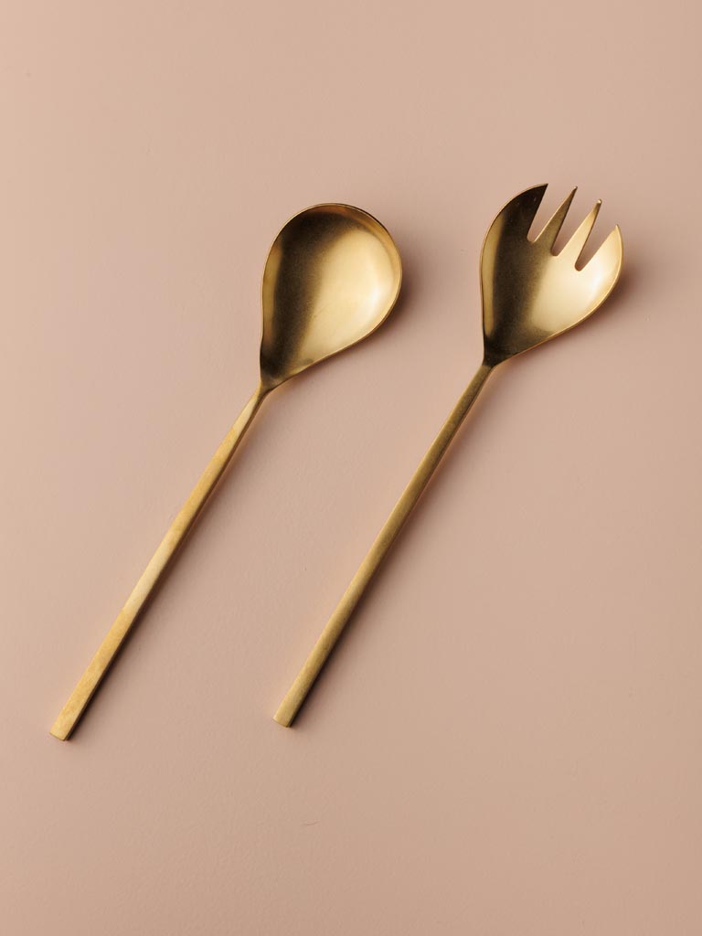 סט של שתי כפות הגשה לסלט, בעיצוב נקי ואלגנטי, בגימור זהב עתיק שמעניק להן נוכחות חמימה ויוקרתית על שולחן האירוח.